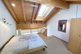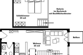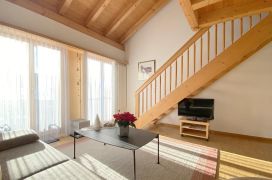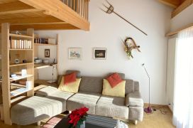 Helle, grosszügig eingerichtete Attika-Wohnung im 2. Stock (65m2). Ruhig gelegen mit sonnigem Balkon. Das gemütliche Wohnzimmer mit Parkettboden ist mit einheimischem Fichtenholz und einer Sitzgruppe ausgestattet. Grosses Doppelschlafzimmer mit 2 Einzelbetten und grossräumigem Schrank auf der Galerie (Teppichboden) mittels interner Treppe erreichbar. Die Galerie enthält ein Dachflächenfenster das im Sommer geöffnet werden kann. Die Wohnung bietet kostenloses WLAN und Swisscom-TV. Die Wohnung enthält ausserdem eine Essecke und eine offene Küche mit grosszügigem Inventar. Die Küche ist abgetrennt und mit 4 Kochplatten, Backofen, Mikrowelle, Geschirrwaschmaschine, Kühlschrank mit TK-Abteil und Nespresso Kaffeemaschine ausgestattet. Im Eingangsbereich (Bodenpatten) befindet sich eine offene Garderobe mit Schrank. Das Bad enthält eine Dusche mit Glaswänden, WC und Lavabo.