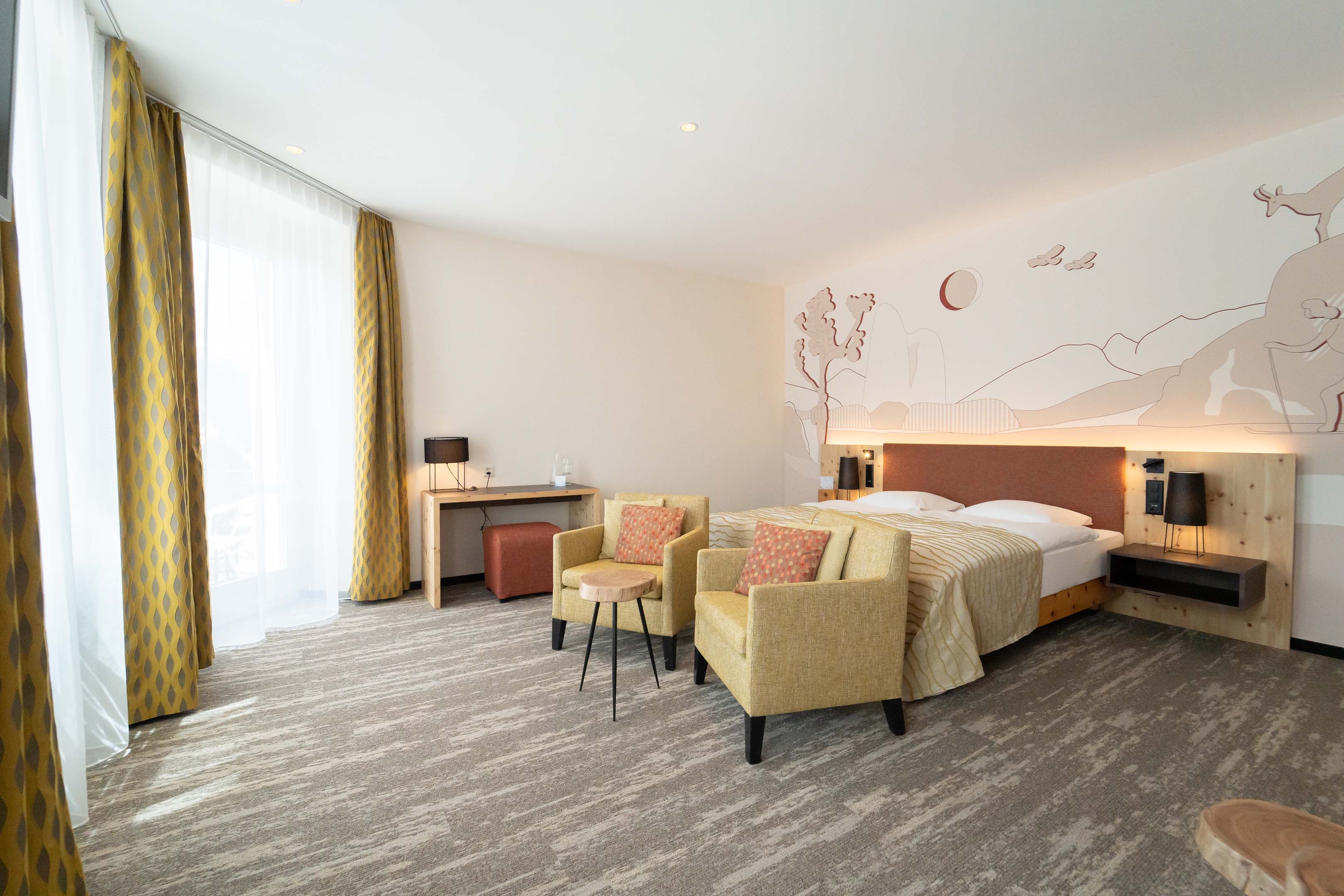 Geräumige Doppelzimmer mit freiem Blick auf das Rosegtal oder Traisfluors und Piz Padella. Engadiner Sgrafitti, Möbel aus Arvenholz und frische und natürliche Farben schaffen ein Gefühl von Heimat. Zwei hochwertige Doppelbetten à 90x200cm für einen tiefen Schlaf, gemütliche Designersessel oder Couch mit Pouf zum Relaxen.
